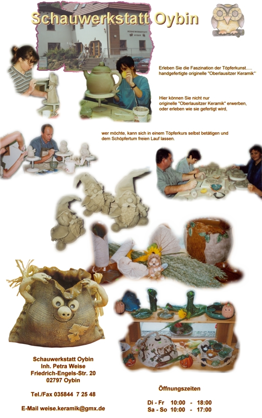 | Die Schauwerkstatt Oybin ist Lieferant unsrer Zittauer Tee-Dippel, die eigens für uns angefertigt werden. Darüber hinaus führen wir eine kleine Auswahl an Produkten dieser einheimischen Töpferwerkstatt.  Für Interessenten dieser Handwerkskunst ist der Besuch in der Schauwerkstatt Oybin auf jeden Fall zu empfehlen. |